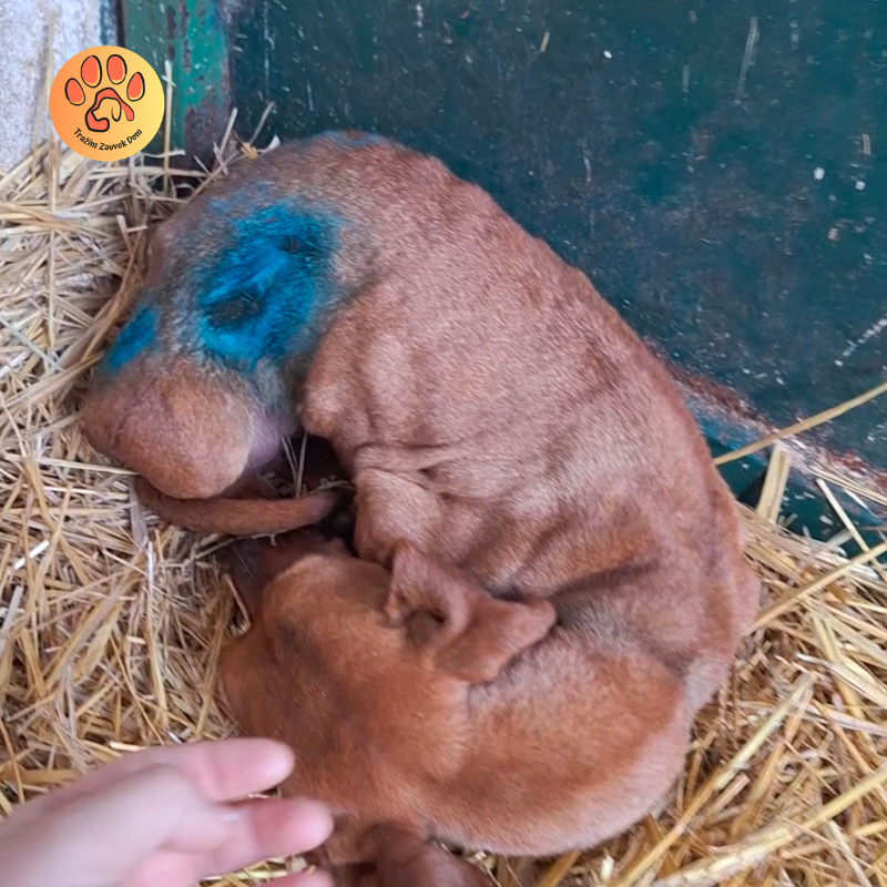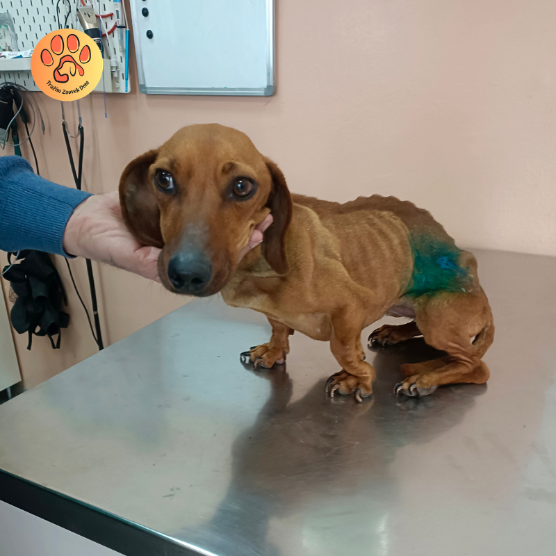 Jazavičarka, pronađena u jezivom stanju, nakon što su je napali drugi psi. Premršava i u teškom stanju.